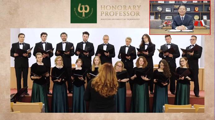 李忠献董事长对比亚威斯托克工业大学授予其荣誉教授称号表示感谢,并指出公司近年来取得的成就和进步,得益于中国的全面对外开放政策,得益于公司全面实施教育国际化战略的创新发展理念。两校在相互信任、真诚合作、共同发展的基础上建立了深厚的友谊,取得辉煌的成绩。未来将尽全力为促进两校及中波高等教育科技文化交流做出应有的贡献。随后,比亚威斯托克工业大学合唱团现场用中文演唱了《大海啊,故乡》,将整个授予仪式推向高潮,中波友谊源远流长。