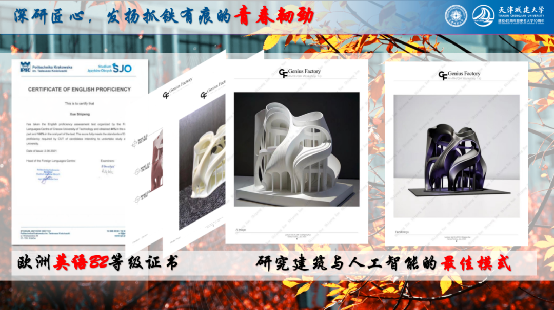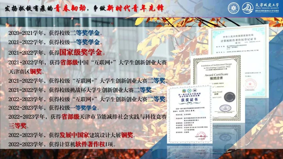 成功考取欧洲英语B2等级证书。积极参加建筑工作坊,寻找建筑与人工智能的最佳模式,把握建筑业发展的未来趋势。共夺得互联网+省部级铜奖、节能减排竞赛赛省部级三等奖、发展中国家建筑设计大展等各类荣誉20余项。