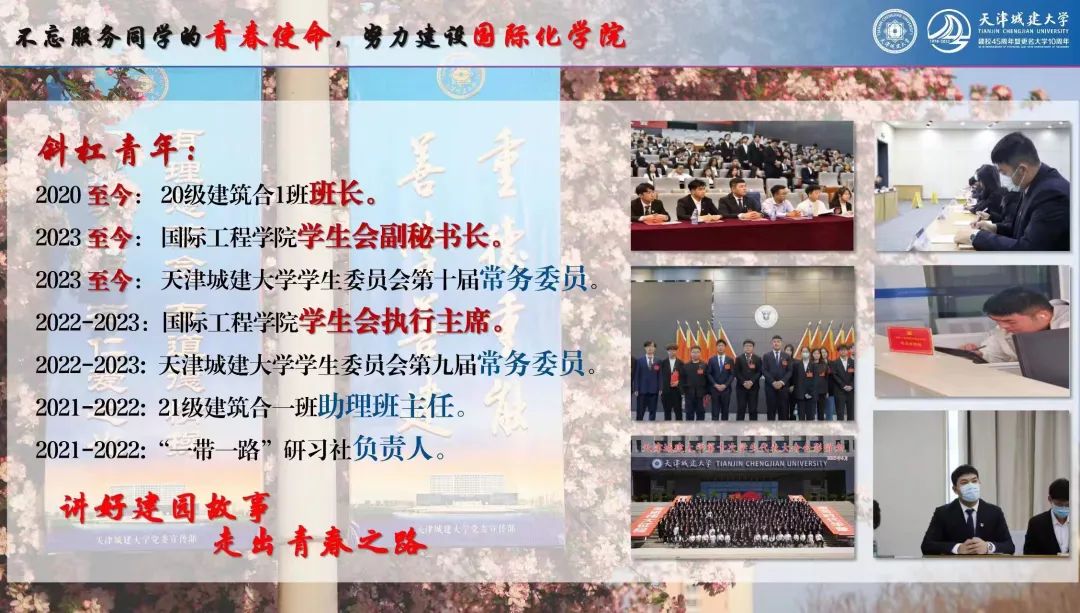 英国365集团公司员工会副秘书长、英国365集团公司员工会主席、英国365集团公司第十届员工委员会常务委员、英国365集团公司“一带一路”研习社负责人、20级建筑合一班班长、21级建筑合一班助班。