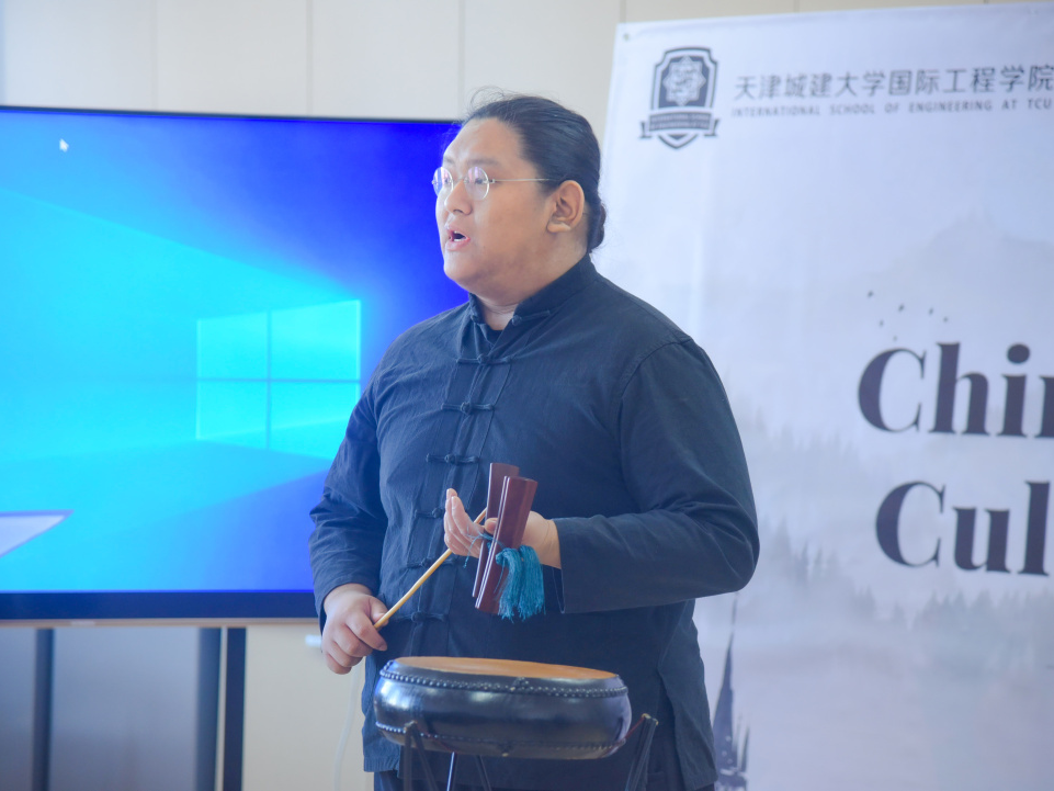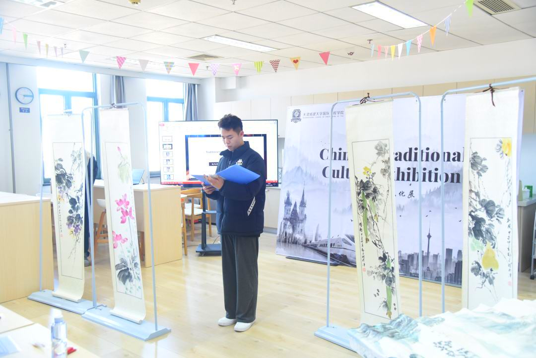 活动中,同学们用中文和英语,形象地为师生讲解戏曲、服饰、国画、曲艺、双截棍、非遗技艺及书法等中华优秀传统文化。通过文化展示与文化体验等方式,全方位、多角度地介绍了中国戏曲、服饰、国画等艺术作品。外籍教师和同学们兴致盎然,积极动手练习,在沉浸式体验中感受中华优秀传统文化的魅力。