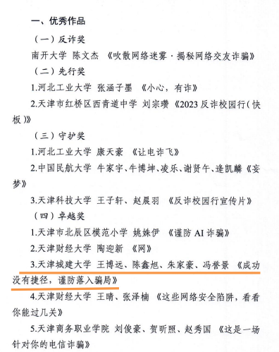 1月2日,由天津市教育委员会、天津市公安局、天津市互联网信息办公室公布“2023反诈校园行”评审结果,2021级本科生王博远组织开展的短视频《成功没有捷径,谨防落入骗局》荣获校园反诈短视频卓越奖。