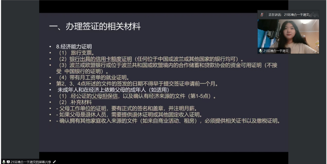 本次会议由2021级建筑学王博远、2021环境工程专业于滟文同学分别向建筑园林专业、土木环境专业同学详细介绍留学前签证材料准备细则以及在CUT、BUT职工活中的相关经验,积极发挥朋辈帮扶引领作用,助力打造国工“传、帮、带”互助模式。两位同学分别讲述了前期公司的充分准备工作以及在波兰学习与生活情况,并就自身体会分享了留学期间的收获。