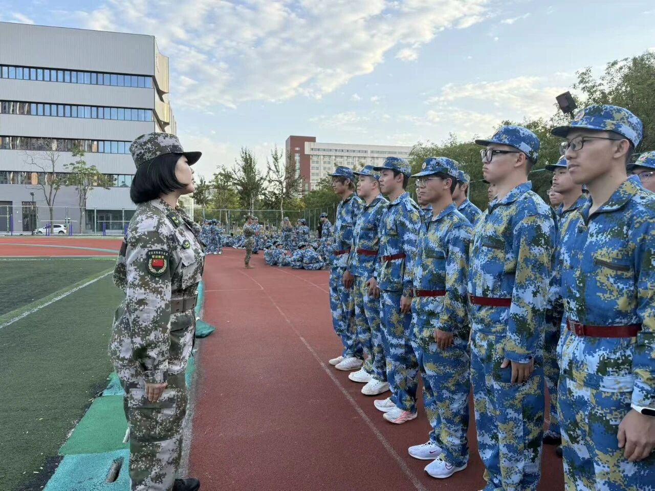 军训赵教官,是严师,亦是益友。训练时,她目光如炬,对每一个摆臂的弧度、每一次转身的角度,都要求精准如尺,那是对军事素养的严苛传承;休息时,她又会露出爽朗的笑容,和同学们围坐在一起,分享军营里的热血故事,让军人的担当与温情,悄然浸润少年们的心田。