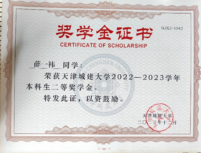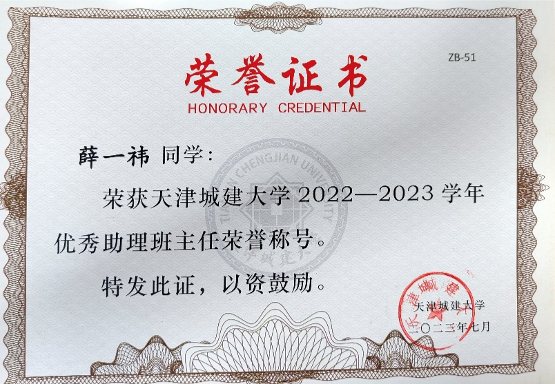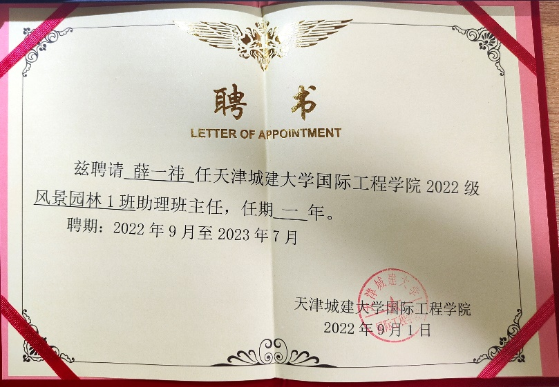 2023年,我以认真的学习态度完成中外双方课程,多门功课成绩获A,并取得欧洲英语B2等级证书。在担任22园林合一助理班主任期间表现突出,获评2022-2023年度校级“优秀助理班主任”。
