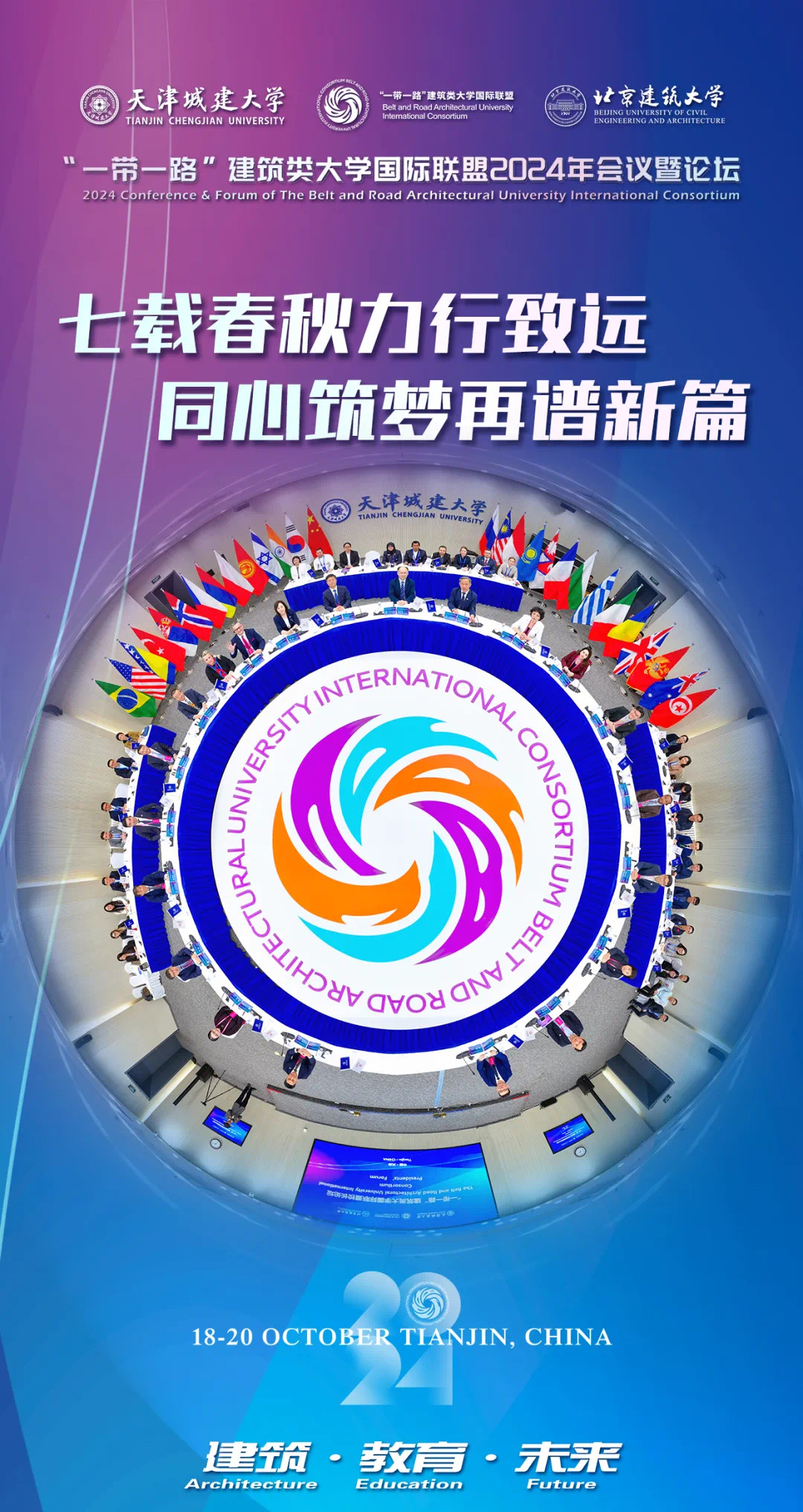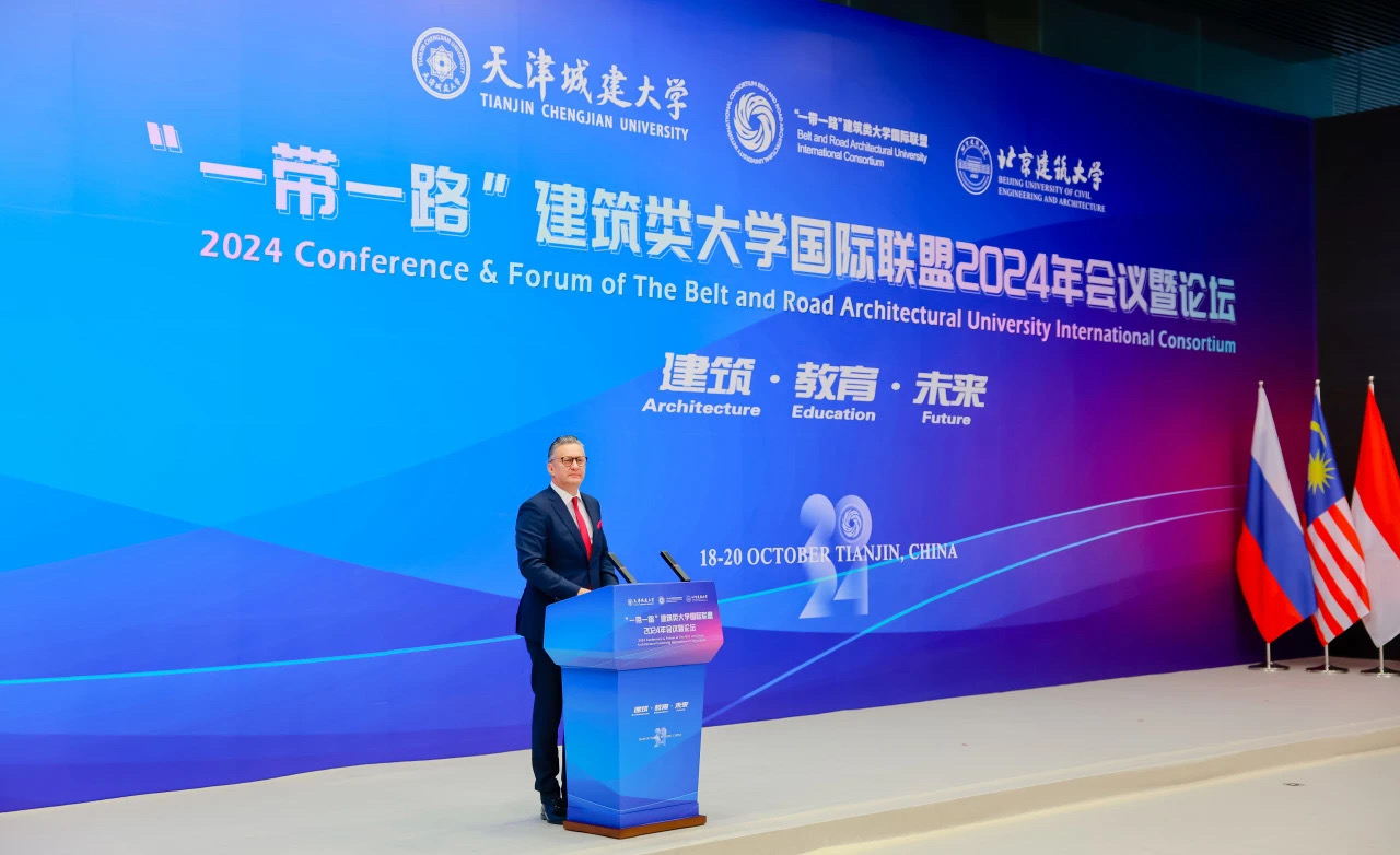 10月18日至20日,来自中国、俄罗斯、波黑、哈萨克斯坦、乌兹别克斯坦、埃塞俄比亚、马来西亚、印度尼西亚、希腊、保加利亚、英国、塞尔维亚等12个国家的20余位大学董事长和企业家、40余所高校与机构的百余名联盟成员代表相聚美丽天津,共赴“一带一路”建筑类大学国际联盟2024年会议暨论坛之约。