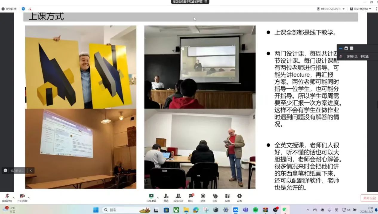 在三位老师的精彩汇报之后,各专业研究生同学们积极分享11月份学习感悟,环境专业的王一楠、土木专业徐俊逸、建筑专业李欣睿、园林专业李丽伟四位研究生同学分别针对自己近期的学习生活和赴波以来的心得体会进行了分享汇报,同学们在分享中以饱满的热情和积极的态度面对波兰的学习生活,积极学习专业知识,开拓国际视野,增强自主实践能力,努力成为服务“一带一路”建设的国际化复合型工程人才。