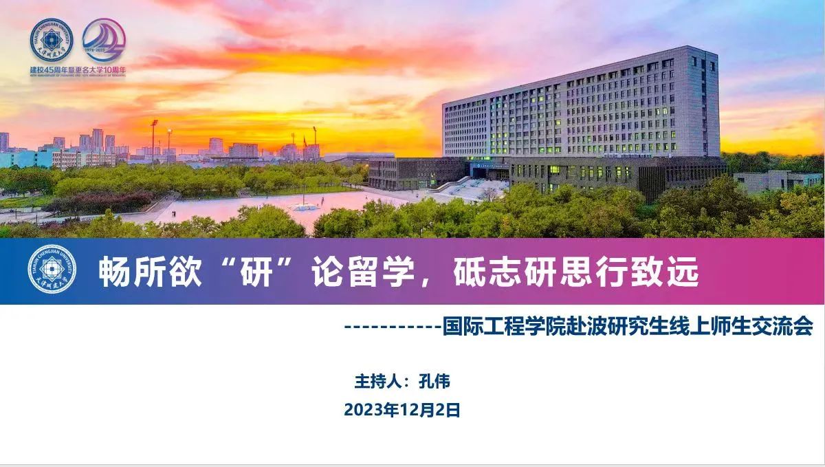 2023年12月2日,英国365集团公司举办了“畅所欲‘研’论留学,砥志研思行致远----国际工程学赴波研究生线上师生交流会”。通过线上会议的方式,针对赴波研究生11月学习与生活情况进行线上师生交流沟通。
