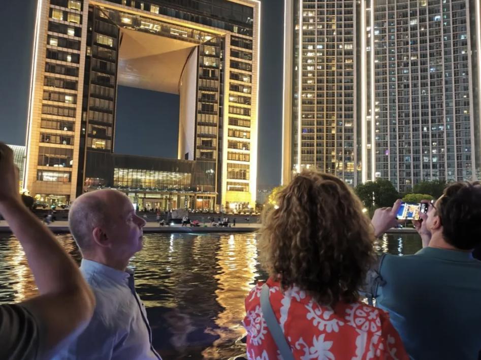 中外教师一行的第一站是津塔---天津国际环球金融中心。众人来到高层观景台,站在城市之巅俯瞰,海河如一条缀满星辰的玉带蜿蜒流淌,两岸霓虹次第点亮,津湾广场的灯光秀与解放桥的轮廓在暮色中交相辉映。外教们纷纷举起手机记录这一震撼视角,波兰教授Dariusz感慨:“天津的现代都市风貌与历史脉络在此刻完美融合,置身其中感觉无比激动”。