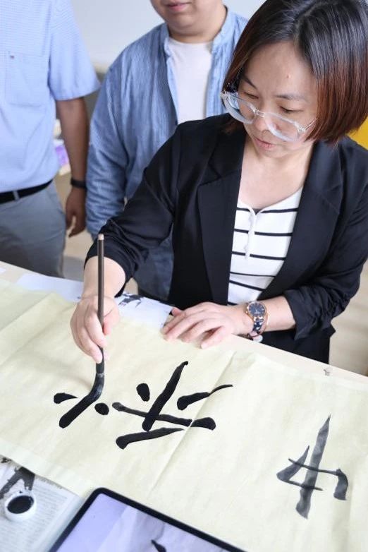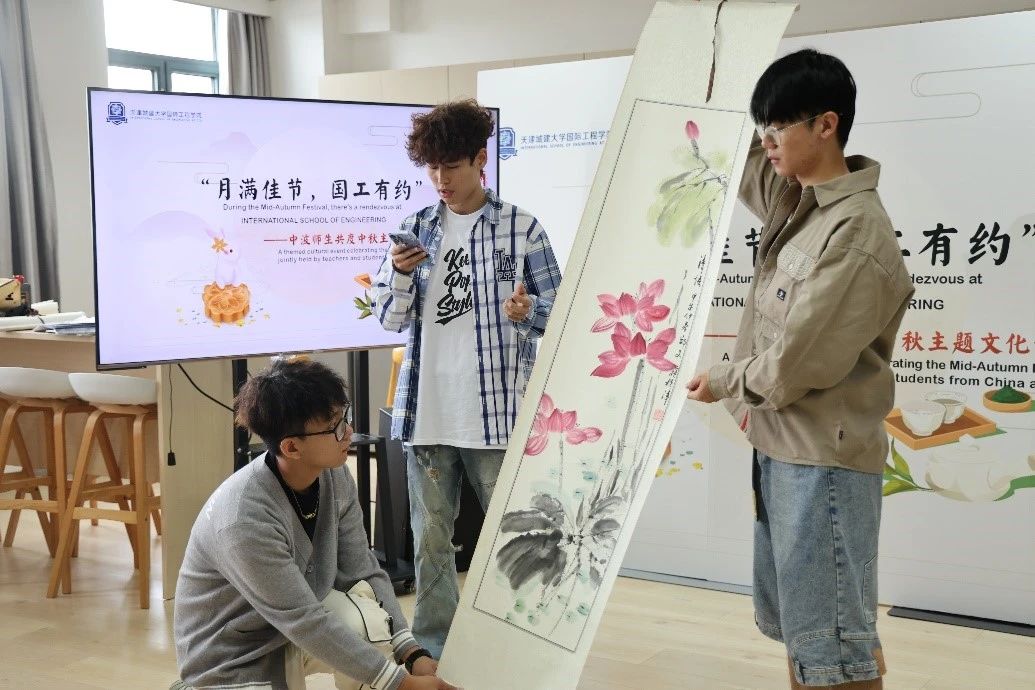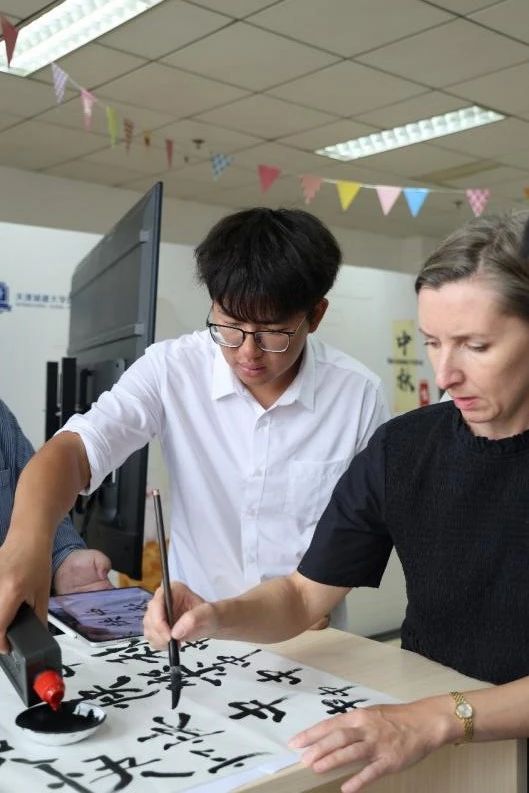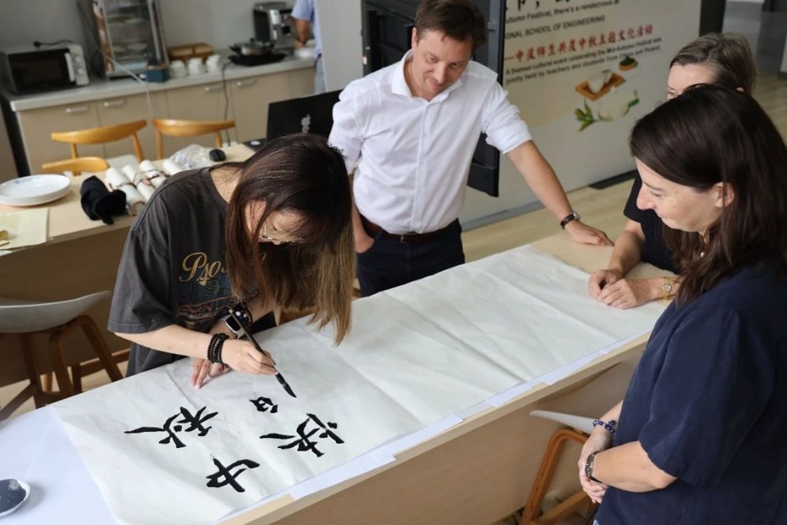 携一纸水墨回嗅记忆中的芬芳,墨香浓浓,融尽千年古韵;国工学子于中秋佳节执笔落墨,为外籍教师展示书法作品、传统国画,一横一竖含情意绵长,一笔一画留无限相思。