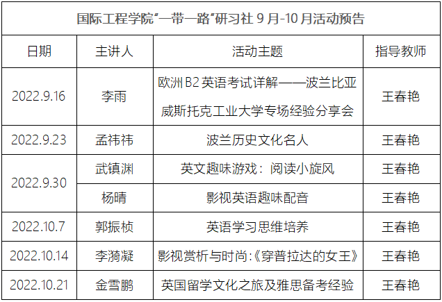 此次“欧洲B2英语考试详解——波兰克拉科夫工业大学专场经验分享会”为提升新生学习兴趣、做好英语学习规划起到了良好的引领作用。以下是研习社9月-10月英语学习学习活动预告,欢迎同学们踊跃参加。